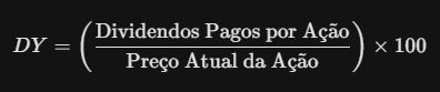 O DY mostra quanto a empresa pagou em dividendos nos últimos 12 meses em relação ao preço atual da ação.